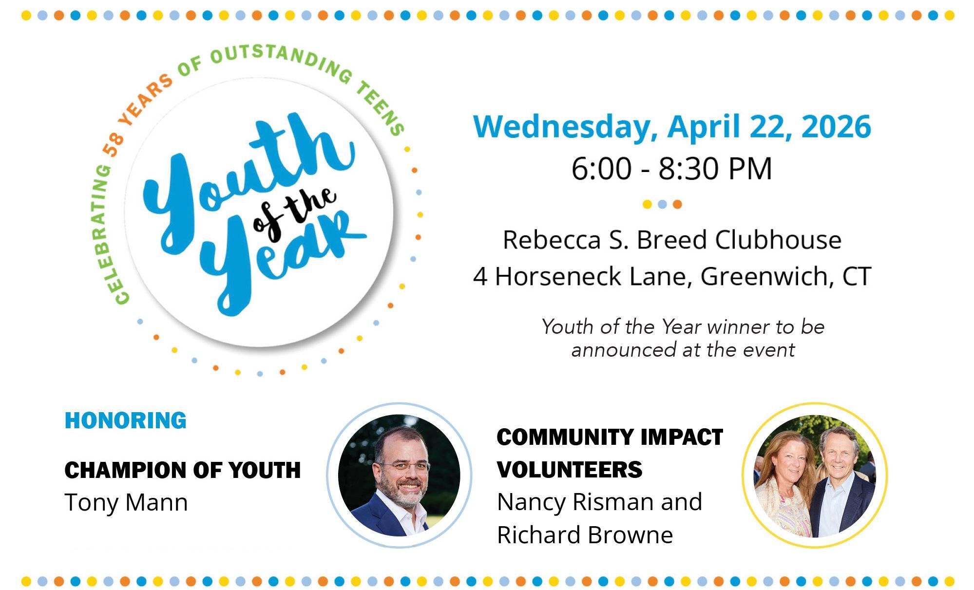 The Boys & Girls Clubs of America Youth of the Year Program is an annual initiative to foster young people’s personal growth and leadership qualities, and the highest honor a Boys & Girls Club member can achieve. Greenwich’s Youth of the Year program was established in 1969 to recognize club members who give back to their club and community. Recipients of the honor have demonstrated service to club, community, and family; academic success; strong moral character; life goals; and poise and public speaking ability.